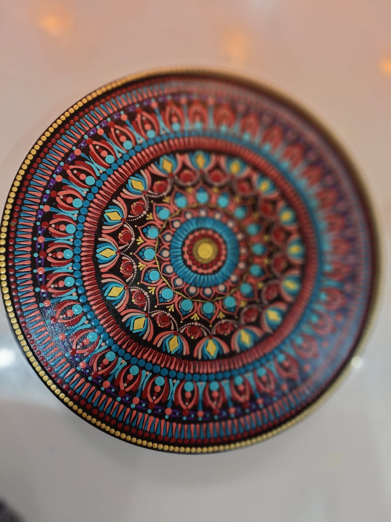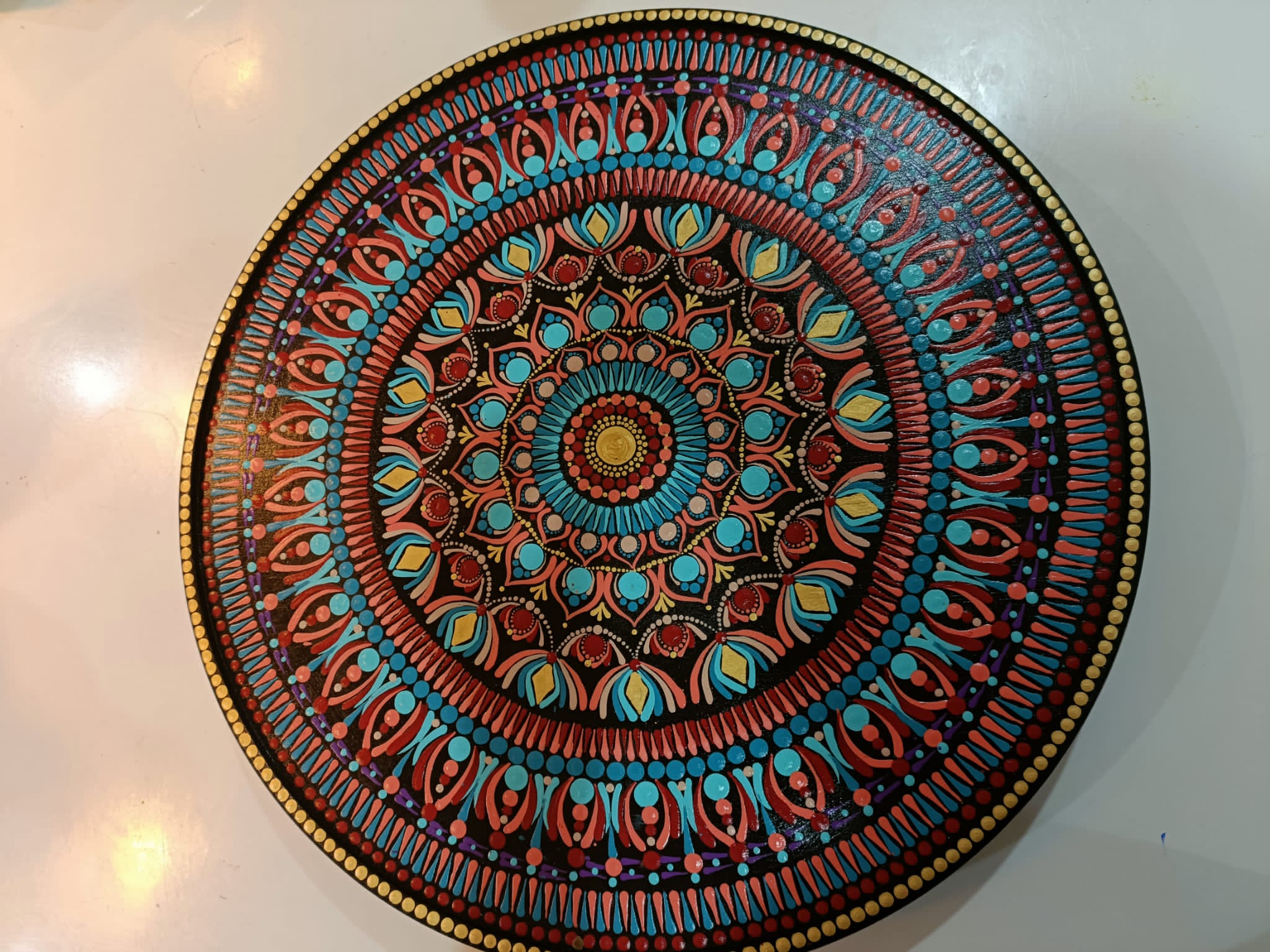 This is a lazy Susan with vibrant colours. Painting a mandala with such fine details helps in increasing focus & concentration span.