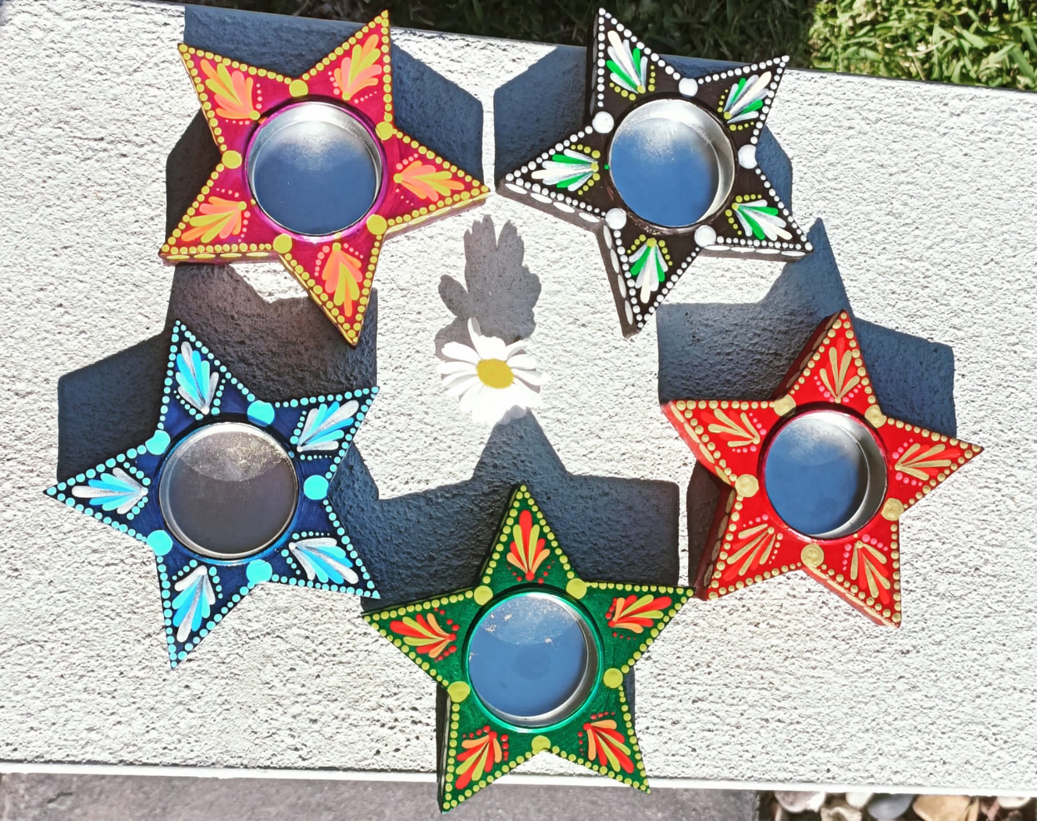 A perfect return gift for house warming, Navratri. Can be used in your mandir with candles. Special star cut wooden piece painted beautifully with mandalas