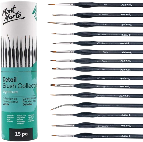 Mont Marte Detail Paint Brush Collection, 15 Piece, Taklon Bristles, Suitable for Acrylic, Oil, Watercolour and Gouache Paints, Includes Storage Bag