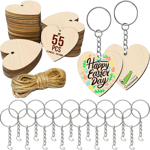 80 PCs Wooden Keyring Blanks Hearts Set: 55 Blank Wooden Hearts 5cm + 25 Keychains - Unfinished Wooden Hearts for Crafting Wood Keyrings